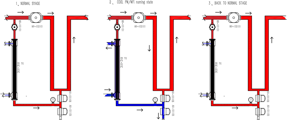 Mematuhi peraturan ketat FDA, USP ASME BPE, dan GMP di industri farmasi. Ketika sistem tidak berfungsi, air panas di sirkulasi utama dapat terus didesinfeksi untuk memenuhi sebagian besar kondisi kerja dan terdapat beberapa pilihan proses yang tersedia.